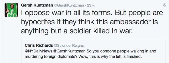 Обозревателя NYDN, по его признанию, не удивил снимок убийцы, стоящего над бездыханным телом Андрея Карлова, и он не собирается «проливать слёз» по русскому дипломату. Он вообще считает, что убить посла России в Турции должны были несколько месяцев назад: дескать, ещё в начале октября Washington Post предлагала именно такое развитие событий. «Видимо, нет никакого способа для международного сообщества, чтобы остановить продолжающиеся военные преступления, совершаемые сирийским режимом и его российскими союзниками, особенно в Алеппо. Но нагло презирая международное право, лидеры и неприметные чиновники в обеих странах открывают себя для свершения справедливости в будущем разными способами», – писала сия газета 9 октября 2016 года.