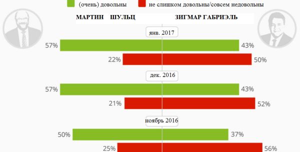 Замена лидера СДПГ понятна из тех соображений, что в состязании с Ангелой Меркель у Шульца сравнительно больше шансов: при выборе между Меркель и Шульцем соотношение голосов опрошенных составляет 43:36, а между Меркель и Габриэлем 57:19 (опрос проводился 5-6 декабря 2016 г.).