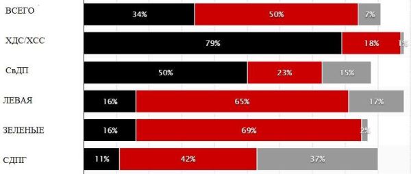 Предпочтения среди сторонников политических партий, в % от общего числа опрошенных. Чёрный цвет – за Меркель, красный – за Шульца, серый – за другого кандидата