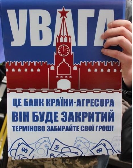Сбербанк, который не планировал уходить с Украины, считает решение Украины о санкциях против его «дочки» дискриминационным и политически мотивированным. Сбербанк обратился в украинскую полицию после ряда акций «активистов», венцом которых стала блокада центрального офиса этого финансового учреждения в столице «Правым сектором» и политической структурой «Азова» – «Национальным корпусом». Санкции СНБО, введённые указом Порошенко, также не добавили оптимизма Сбербанку, для которого вопрос сворачивания деятельности на Украине не стоял в повестке дня. «Введение санкций на фоне физического блокирования центрального офиса и ряда отделений банка представителями радикальных организаций, а также непрекращающихся актов вандализма в отношении имущества банка при полном попустительстве органов правопорядка, которые уже привели к введению лимитов на клиентские операции, является подтверждением нежелательности для нынешних властей присутствия инвестиций Сбербанка в стране» – так комментируют украинские события в Сбербанке.