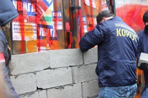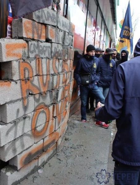 В Тернополе замуровали очередное отделение украинской дочки российского Сбербанка. Радикалы «Правого сектора», «Национального корпуса» («Азов») и «Сокола» раскрасили окна, двери и вывески с помощью баллончиков, на скорую руку заложили кирпичами вход в отделение и пообещали не останавливаться на «мирных акциях», если работа банка на Украине не будет прекращена. «Мы пытаемся закрыть этот банк ещё с прошлого года», – говорит местный руководитель «Национального корпуса». По его мнению, российский бизнес на территории Тернопольской области должен быть запрещён. А «коллега» из «Правого сектора» дополняет: «Сегодня мы пришли к тому, что нужны активные действия». Эти слова означают, что националисты просто разгромят тернопольское отделение Сбербанка, если его не закроют официально.
