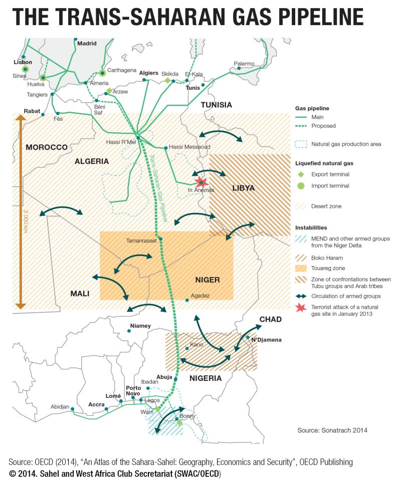 Впрочем, перманентная нестабильность в Ливии и в странах Сахеля, обусловленная действиями радикальных джихадистских группировок, а также разношёрстного сброда наёмников всех мастей (включая колумбийских и украинских) ставят под сомнение целесообразность строительства «сухопутных» трансграничных трубопроводов. Альтернативный проект, известный как «Атлантическая Африка», предполагает строительство трубопровода вдоль Атлантического побережья для транспортировки нигерийского газа в Европу и поддерживается в первую очередь Королевством Марокко – основным региональным конкурентом Алжира, а также Эмиратами и Соединёнными Штатами. Проект инвестиционной стоимостью около 25 млрд долл. быстро продвигается и не исключено, что именно это обстоятельство вынудило Алжир активизироваться после десятилетий безразличия к Транссахарскому газопроводу. Алжир вовсе не стремился предоставлять по своей территории европейцам доступ к нигерийской нефти, однако марокканцы и их партнёры не дремлют, так что не исключено, что идея газопровода через Нигер так и останется нереализованной.