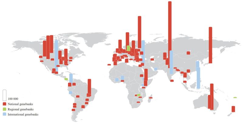 Подавляющая часть мировых запасов генетических материалов растений - около 84% - хранится в национальных генных банках. В международных центрах хранится 15% процентов, в региональных – 1%. С 2009г. объем коллекций зародышевой плазмы увеличился в общей сложности на 8%.