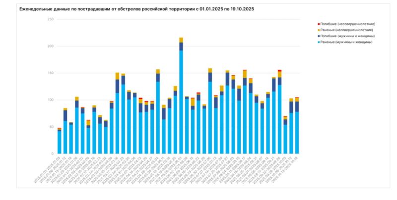 По данным, собранным и верифицированным службой Посла по особым поручениям МИД России по преступлениям киевского режима, за минувшую неделю от обстрелов украинских нацистов пострадали 105 мирных жителей: ранены 85 человек, в том числе семеро несовершеннолетних, погибли 20 человек, в том числе один несовершеннолетний. Всего же по гражданским целям на российской территории за прошедшие семь дней украинские вооруженные формирования выпустили не менее 3 595 боеприпасов, среди которых были РСЗО (122 мм), артиллерийские снаряды калибром 152 и 155 мм, в т.ч. с кассетной боевой частью, мины, гранаты, также противник активно применял ударные БПЛА, стрелковое оружие.