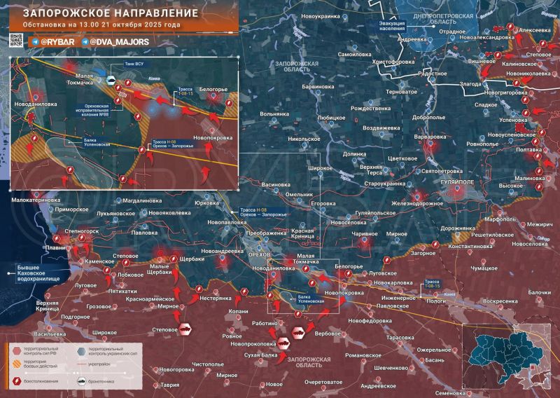 На ЗАПОРОЖКОМ НАПРАВЛЕНИИ российские войска перешли в наступление у МАЛОЙ ТОКМАЧКИ. Вечером понедельника 20 октября поступили сообщения о массированной атаке ВС РФ несколькими колоннами бронетехники сразу на трёх направлениях, – пишет Телеграм-канал Рыбарь.