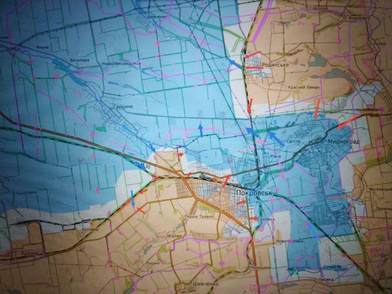 Около 70% ПОКРОВСКА – уже под контролем подразделений ВС РФ. Противник вытеснен в основном за ж/д и отрезан от ГРИШИНО в районе посёлка 8-я группа. Южнее ж/д – зачистка территории города.