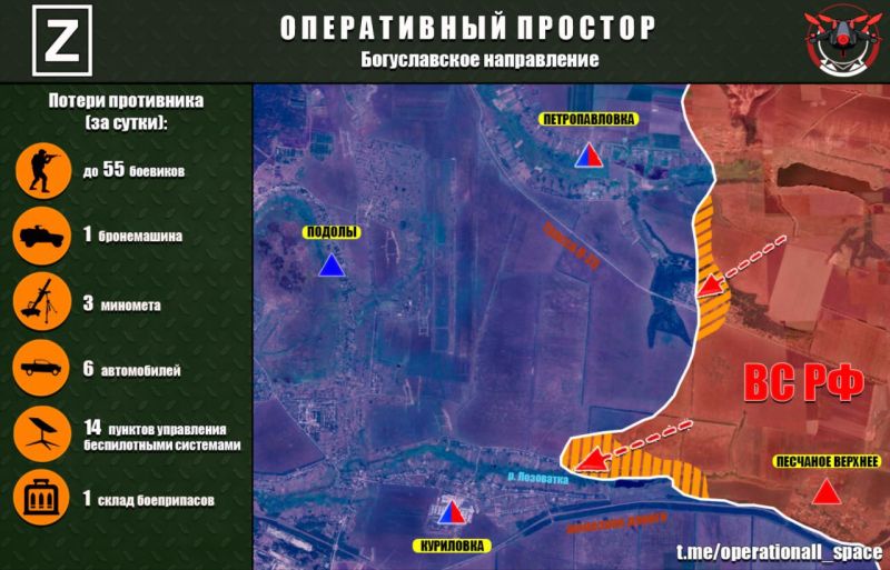 На левом берегу ВС РФ продвинулись к РЫБНОМУ и в направлении СЛАДКОГО, установили устойчивый контроль в НОВОНИКОЛАЕВКЕ, ведут бои по ликвидации района обороны ВСУ южнее и ведут бои за УСПЕНОВКУ, бывший крупный логистический пункт противника.