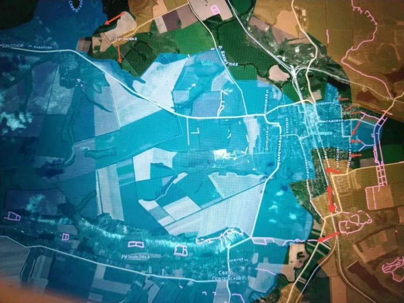 Южнее города наши подразделения атакуют в направлении СВЯТО-ПОКРОВСКОГО и южнее.
