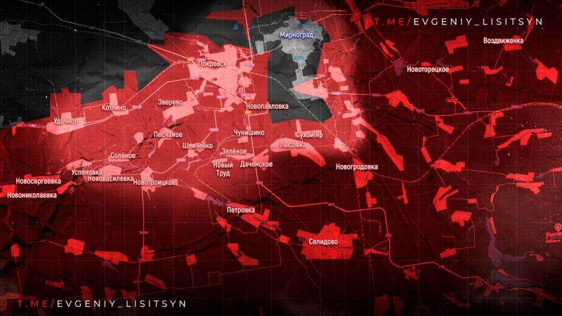 Противник предпринимает контратаки для сохранения контроля над дорогой из ГРИШИНО, Т-образным перекрёстком и п. СВЕТЛОЕ, чтобы иметь возможность логистики с группировкой в МИРНОГРАДЕ (Димитрове).