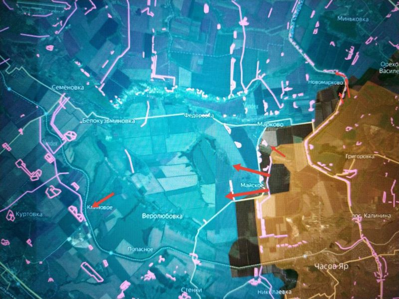Восточнее ВС РФ продавливают оборону ВСУ северо-западнее ЧАСОВ ЯРА у окраин ВЕРОЛЮБОВКИ, выбив противника из МАЙСКОГО, подошли к МАРКОВО и выбили противника восточнее НОВОМАРКОВО вдоль канала, прорываются/просачиваются, обходя очаги сопротивления ВСУ.