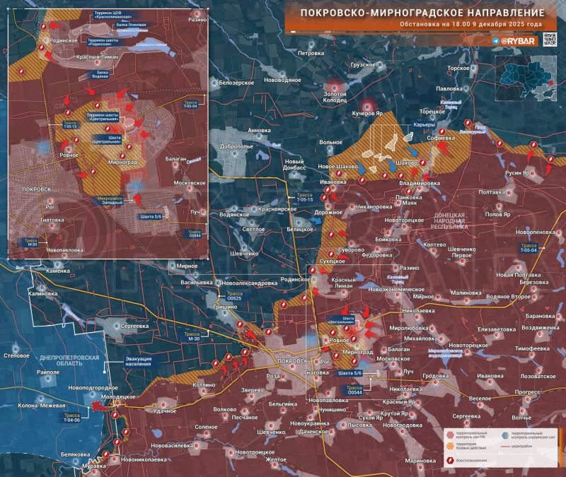 Обстановка для ВСУ ухудшается ежедневно. Постоянные удары ВКС России и блокирование наземных путей снабжения вынуждает ВСУ терять дом за домом. В МИРНОГРАДЕ ВС РФ заняли ещё часть города, противник сохраняет присутствие лишь на северо-западных окраинах и в районе СВЕТЛОГО. Полноценного контроля уже нет: малые группы ВСУ перемещаются по оставшейся «серой» части города и пытаются просочиться из котла, – пишет Телеграм-канал Рыбарь.