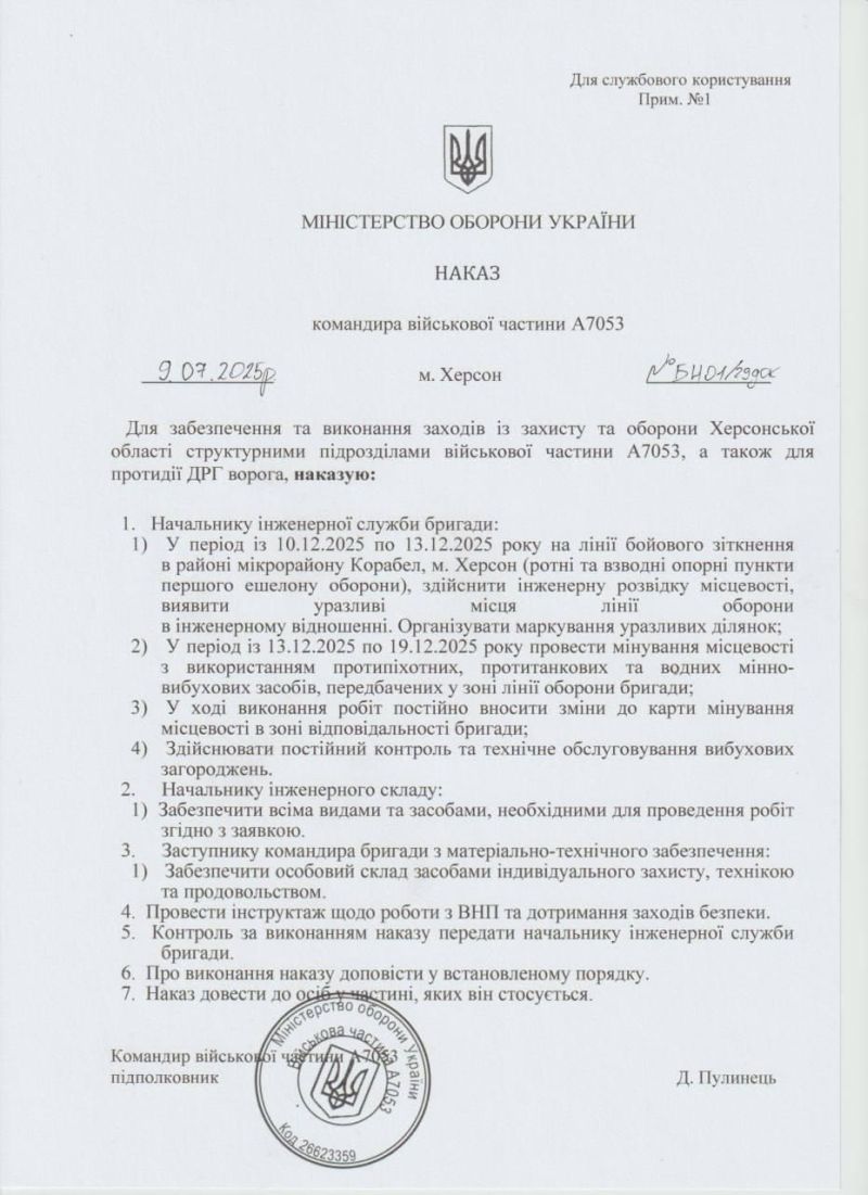 Второй день украинские Телеграм-каналы обсуждают приказ командира воинской части А7053 Вооружённых сил Украины от 9 июля 2025 года, где изложены меры противодействия российским ДРГ на территории оккупированной Киевом части Херсонской области.