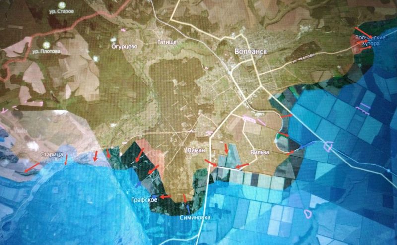 ВС РФ «подвинули» противника в ВОЛЧАНСКИХ ХУТОРАХ со стороны западной части и с севера (со стороны Тихого) на ул. Чигринова. Половина села – за нашими подразделениями, а также отделение почты, район кладбища и почти вся ул. Н. Парасола.