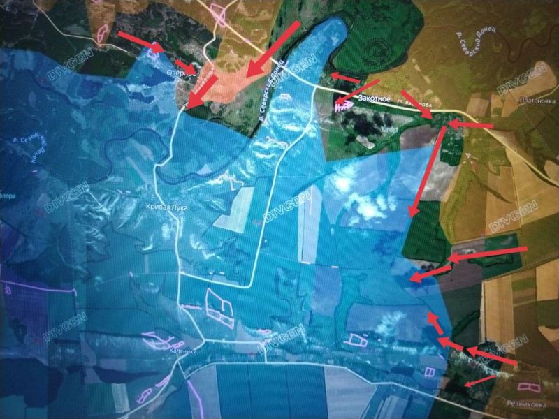 Севернее ЗАКОТНОГО подразделения 25-й А ликвидировали полностью «карман» между ЯМПОЛЕМ и ЗАКОТНЫМ и продвинулись в южную часть ИЛЬИЧЁВКИ (Озёрного), угрожая выходом к с. КРИАЯ ЛУКА с севера (тогда как 3-я А продвигается к нему с востока).