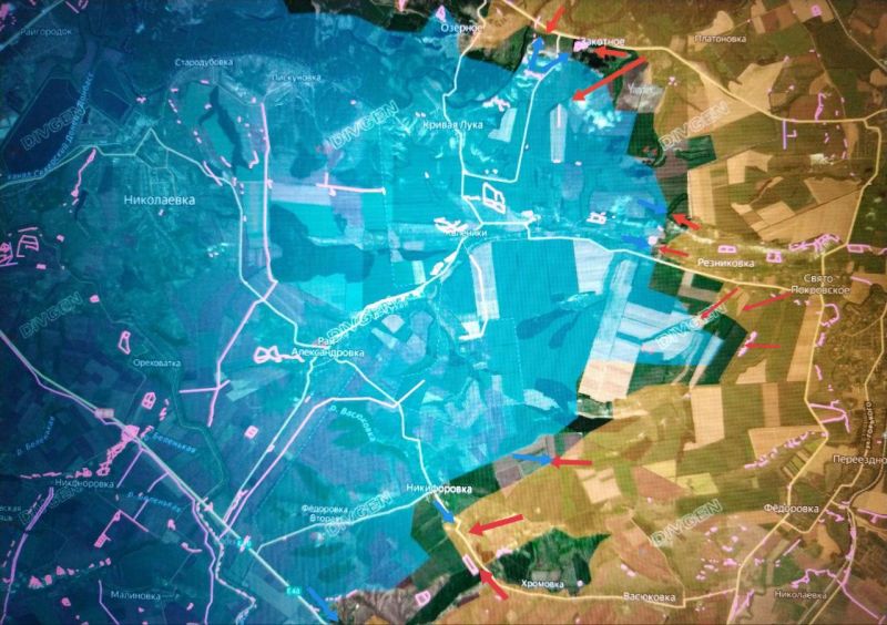 Подразделения ГрВ «Юг» продолжают бои за высоты в районе юго-западная окраина ЗАКОТНОГО – КРИВАЯ ЛУКА – РЕЗНИКОВКА и продвинулись в РЕЗНИКОВКЕ и южнее, заняв позиции противника с которых он контратаковал наши подразделения в РЕЗНИКОВКЕ и КИРОВО (Свято-Покровском), – пишет Телеграм-канал Военкор Котенок.