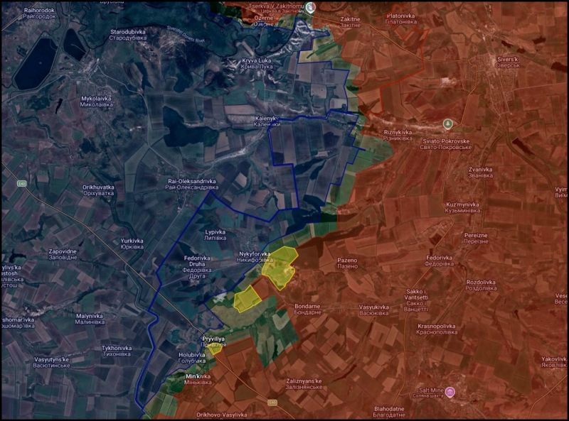 Основные бои идут за НИКИФОРОВКУ и прилегающие посадки. Наши подразделения продвинулись западнее БОНДАРНОГО, заняли высоту и вклинились между ПРИВОЛЬЕМ и ФЁДОРОВКОЙ ВТОРОЙ. Под угрозой остаются позиции ВСУ в районе ХРОМОВСКОГО ЛЕСА и ХРОМОВКИ.