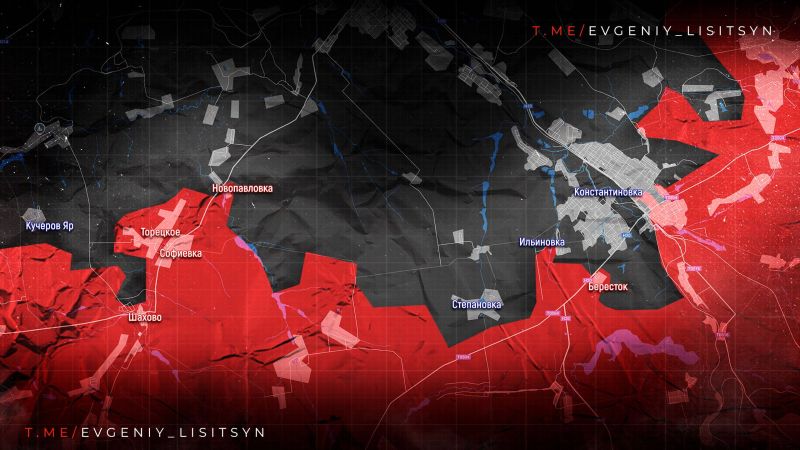 Контратаки ВСУ и очаги сопротивления в БЕРЕСТКЕ. Ожесточённые бои за ИЛЬИНОВКУ (село в серой зоне). Продвижение ВС РФ в восточной части КОНСТАНТИНОВКИ заняты новые позиции.