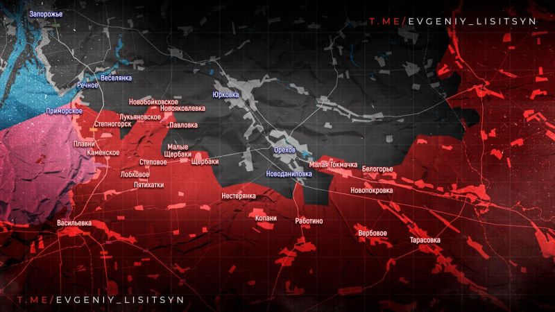 Тяжёлые бои южнее РЕЧНОГО. Попытки закрепиться у ВЕСЕЛЯНКИ, МАГДАЛИНОВКИ и ЗАПАСНОГО. В районе ОРЕХОВА без существенных изменений.