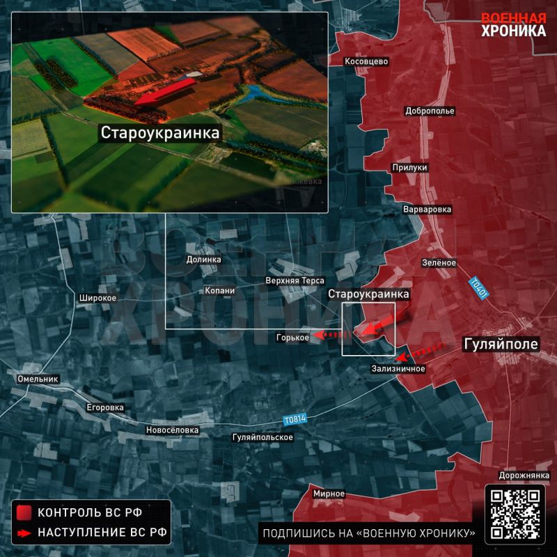 На ОРЕХОВСКОМ НАПРАВЛЕНИИ Запорожского фронта гуляйпольский костяк ГрВ «Восток» высокими темпами продвигается в направлении логистически важного для противника н. п. ОМЕЛЬНИК. На протяжении последних суток штурмовые группы ВС РФ вытеснили формирования 225-го полка и 5-й бригады ВСУ из СТАРОУКРАИНКИ, заняв высоту 150 м и зачистив территорию площадью около 7,5 кв. км. Ширина участка прорыва составила 5,6 км, глубина прорыва – 2,65 км.