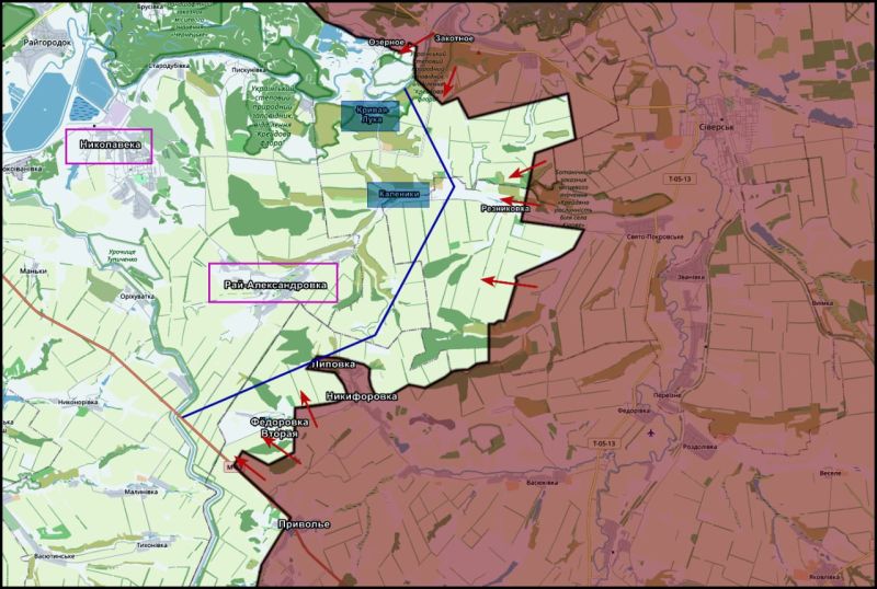 Одновременно наши силы пытаются охватить РАЙ-АЛЕКСАНДРОВКУ с флангов, ведя бои в районах КРИВОЙ ЛУКИ и НИКИФОРОВКИ, а также продвигаясь по балкам, чтобы перерезать логистику противника. Продолжаются встречные бои и зачистки позиций ВСУ в районе ЗАКОТНОГО. Артиллерия и расчёты БПЛА активно работают по тыловым маршрутам противника на линии РАЙ-АЛЕКСАНДРОВКА – КАЛЕНИКИ – НИКОЛАЕВКА вдоль Северского Донца.