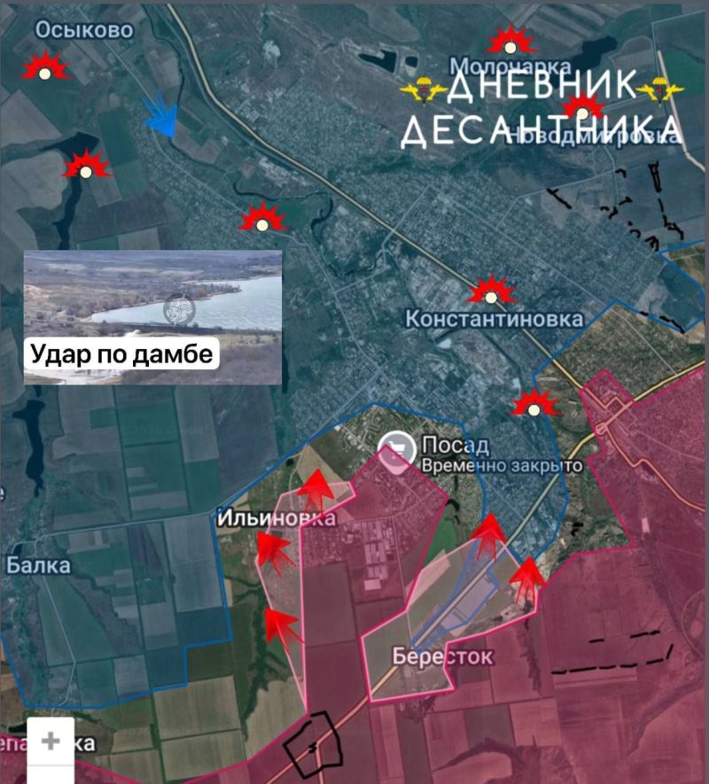 Также наши войска наносят регулярно удары по дамбам северо-западнее КОНСТАНТИНОВКИ, тем самым не только нарушая логистику ВСУ, но и лишая их укрытий из-за подтоплений в результате подрыва дамб.
