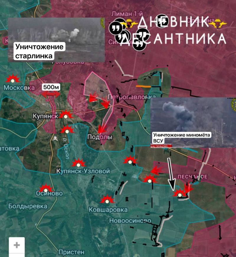 Однако, в районе КУЧЕРОВКИ, ПЕТРОПАВЛОВКИ и ПОДОЛАХ наши войска имеют определённый успех и расширяют зону контроля, с дальнейшим продвижением, для улучшения логистики к Купянску.