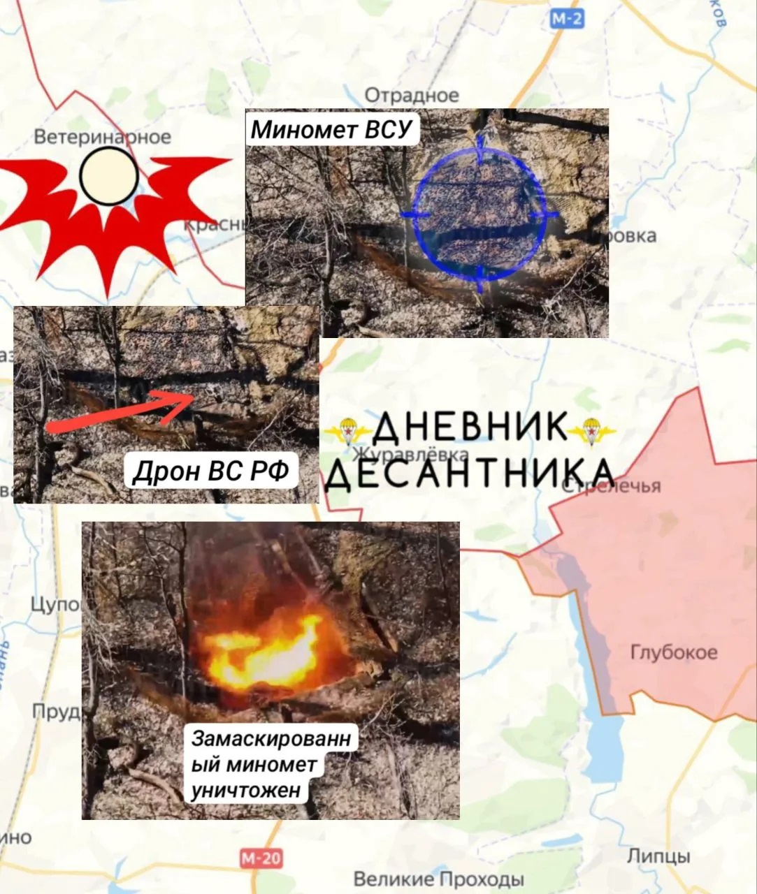 В районе населённого пункта ВЕТЕРИНАРНОЕ наши бойцы в ходе разведки обнаружили вражескую позицию миномётного расчёта, который наносил удары по Белгородской области. Расчёт был хорошо замаскирован, но несмотря на это, точным ударом нашего дрона был уничтожен.