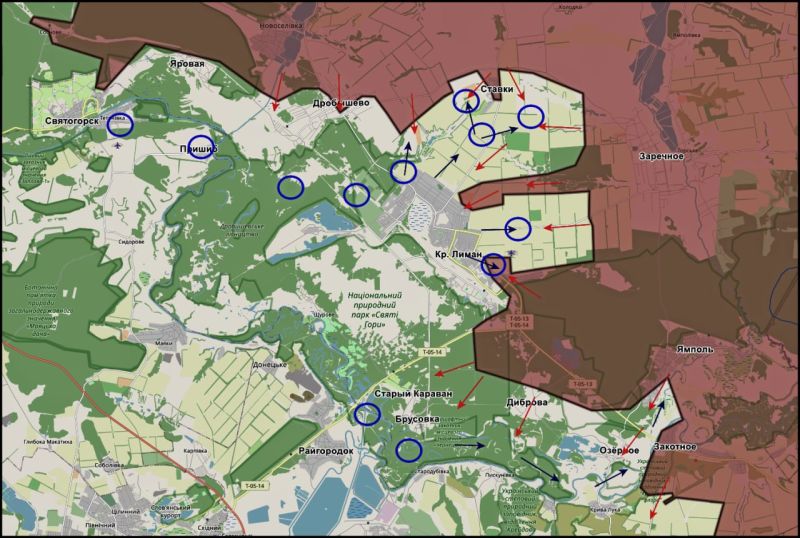 На северном участке фиксировались попытки контратак в районах ЯРОВОЙ и СВЯТОГОРСКА со стороны ПРИШИБА и смежных районов. По данным открытых наблюдений, по выявленным направлениям регулярно наносятся ответные огневые воздействия.
