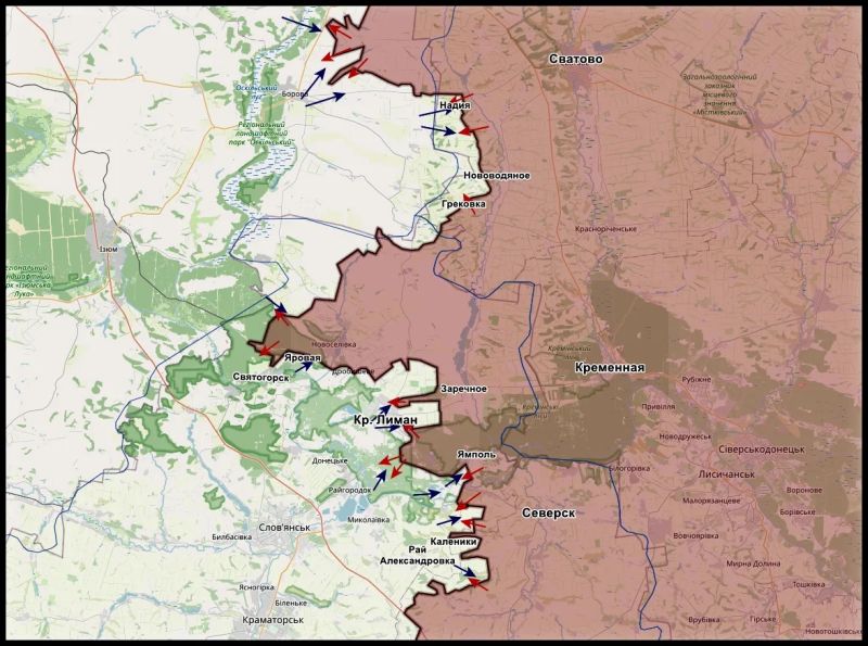 Противник сообщает об инфильтрации наших штурмовых групп в самом КРАСНОМ ЛИМАНЕ. Также идут тяжёлые боевые действия в районе ДУБРОВЫ, СТАРОГО КАРАВАНА и БРУСОВКИ. Ребята пытаются полностью обрезать логистику ЛИМАНА как со стороны южной, так и со стороны северной – в районе ДРОБЫШЕВО, СТАВКОВ, НОВОСЁЛОВКИ, ЯРОВОЙ и в районе СВЯТОГОРСКА, – пишет сообщество KRM РФ в мессенджере МАХ.
