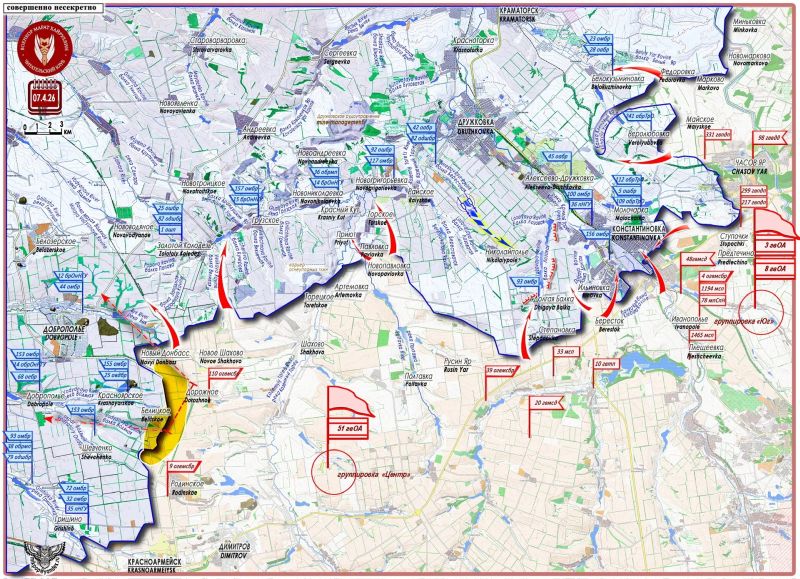 Одновременно центром и правым флангом наши сковывают действия врага, не позволяя ему маневрировать на восточные участки, где соединения группировки «Юг» ведут бои в городе КОНСТАНТИНОВКА и по всей восточной линии на Славянско-Дружковскую агломерацию.