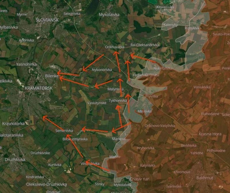 Войска РФ заходят на КРАМАТОРСК с двух направлений, однако спешки в вопросе наступления не проявляется, несмотря на важность штурма этого района наряду со СЛАВЯНСКОМ, – пишет сообщество Военная Хроника в мессенджере МАХ.
