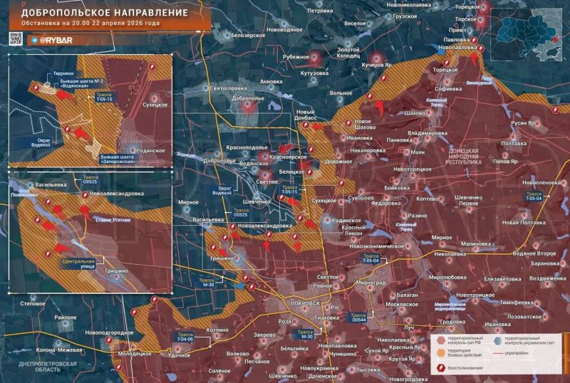 На южном фланге ДОБРОПОЛЬСКОГО НАПРАВЛЕНИЯ бойцы ГВ «Центр» расширяют зону контроля в окрестностях ГРИШИНО. Днём 21 апреля поступили данные о полной зачистке от противника территории села. Тем не менее его окраины всё ещё находятся в «серой зоне», а закрепиться на них российские войска смогут лишь после окончательной ликвидации вклинения противника в районе трассы М-30, – пишет МАХ-канал Рыбарь.