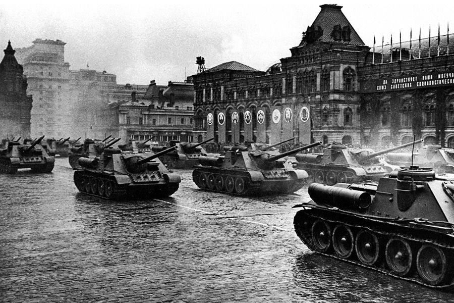 На гранитной брусчатке Красной площади выстроились в предвкушении парада сводные полки десяти фронтов и Военно-Морского флота. «Без трех минут десять. Я был на коне у Спасских ворот, – вспоминал принимавший парад Маршал Советского Союза Г.К. Жуков. – Отчетливо слышу команду: «Парад, смирно!» Вслед за командой прокатился гул аплодисментов. Часы отбивают 10.00... Грянули мощные и торжественные звуки столь дорогой для каждой русской души мелодии «Славься!» М.И. Глинки. Затем сразу воцарилась абсолютная тишина, раздались четкие слова команды командующего парадом Маршала Советского Союза К.К. Рокоссовского...».