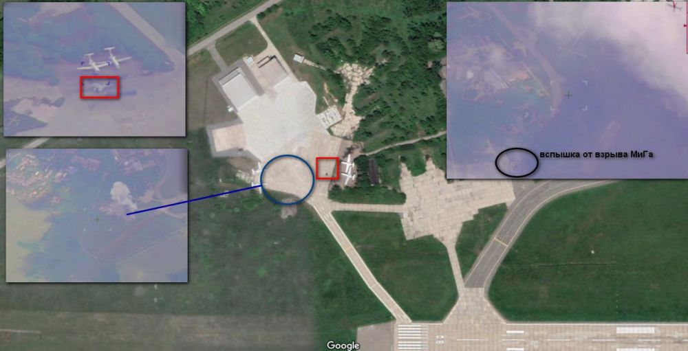 Из-за традиционно отвратительного качества камеры беспилотника «Орлан-10» разобрать что-то на видео трудно, однако приглядевшись видно, что ракета прилетела на стоянку выведенных из строя Як-40, около которых стоит и МиГ-29 ВВС Украины. В конце видеоролика у украинского истребителя видна вспышка, что может говорить о детонации или боеприпаса, или топлива.
