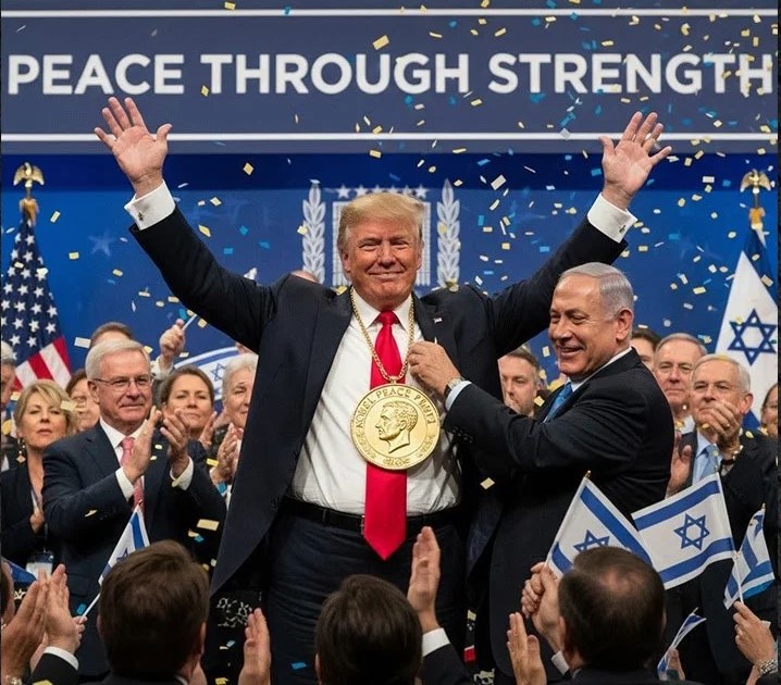 Но не меньше других торжествует и президент США Дональд Трамп, объявляя себя миротворцем. А в Израиле выложили в сеть сгенерированное ИИ фото, на котором Нетаньяху вручает ликующему президенту США Нобелевскую медаль борца за мир.