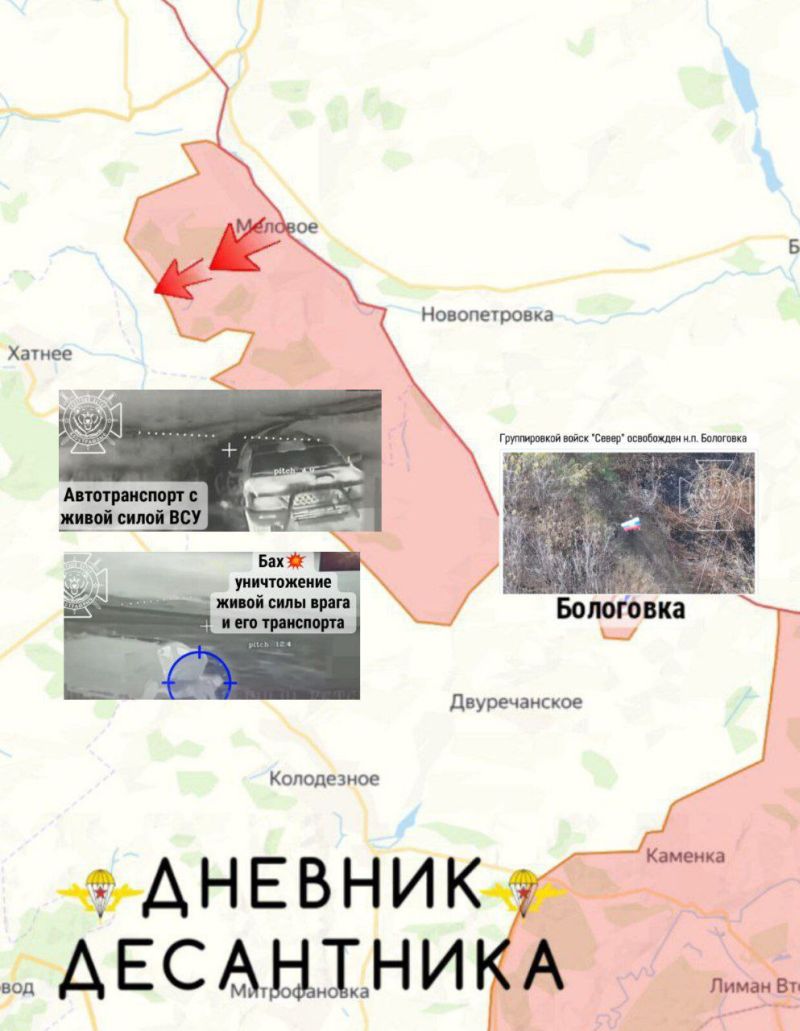 Оперативная ситуация на КРАСНОЛИМАНСКОМ и СЕВЕРСКОМ ФРОНТАХ впервые с начала СВО складывается таким образом, что наступающие группировки соединились после того, как враг был выбит из МЕДОВОГО ЛЕСА и наши боевые порядки начали бои в дачах в предместье КРАСНОГО ЛИМАНА.