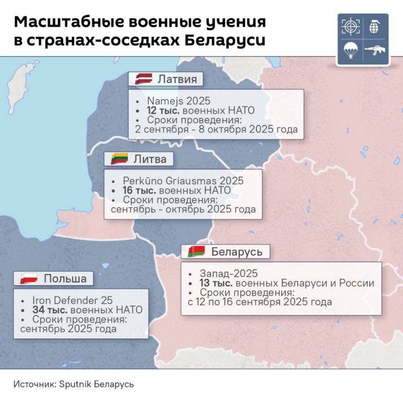 Началось все фактически с крупных учений с участием военных НАТО в Латвии (Namejs), Литве (Perkuno Griausmas) и Польше (Iron Defender), изначально противопоставленных российско-белорусским (Запад-2025). Эскалация достигла пика после залета в польское воздушное пространство неких БПЛА, объявленных «российскими» – под этим предлогом ВС Польши впервые открыли огонь по «российским» (с точки зрения местной пропаганды) целям. 11 сентября Варшава закрыла границу с Белоруссией и РФ.