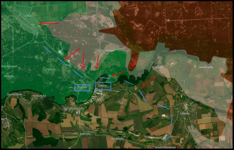 Основная цель ВС РФ – выйти к ЗАКОТНОМУ и ОЗЁРНОМУ. Дроны российских сил интенсивно долетают до СЛАВЯНСКА и наносят удары по ВСУ. В целом всё идёт к тому, что сначала российские войска займут ЛИМАН, а потом – СЛАВЯНСК.