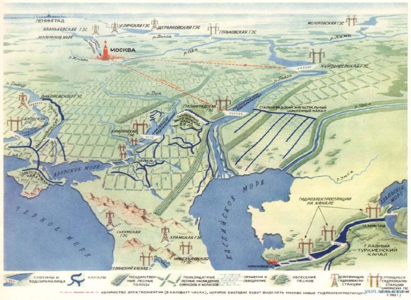 Согласно упомянутому плану, с середины 1953 г. те же мероприятия панировалось проводить в Казахстане, Узбекистане и Туркменистане, а в западном российско-казахстанском приграничье и в ряде районов Туркменистана и Узбекистана соответствующие работы стали проводиться с 1952 года. Но в августе – ноябре 1953 г. успешно реализуемая программа была остановлена как комплексное мероприятие, а в 1958 г. фактически отменена. Причина – природоущербные, зато «рекордные» объемы распашки целины с весны 1954 г., быстрорастущие затраты на небезызвестную кукурузную кампанию со второй половины 1950-х годов. Одновременно в ряде районов Казахской ССР и РСФСР (Южная Сибирь) в ходе целинной и последовавшей кукурузной кампаний стали массово вырубаться уже созданные лесополосы...
