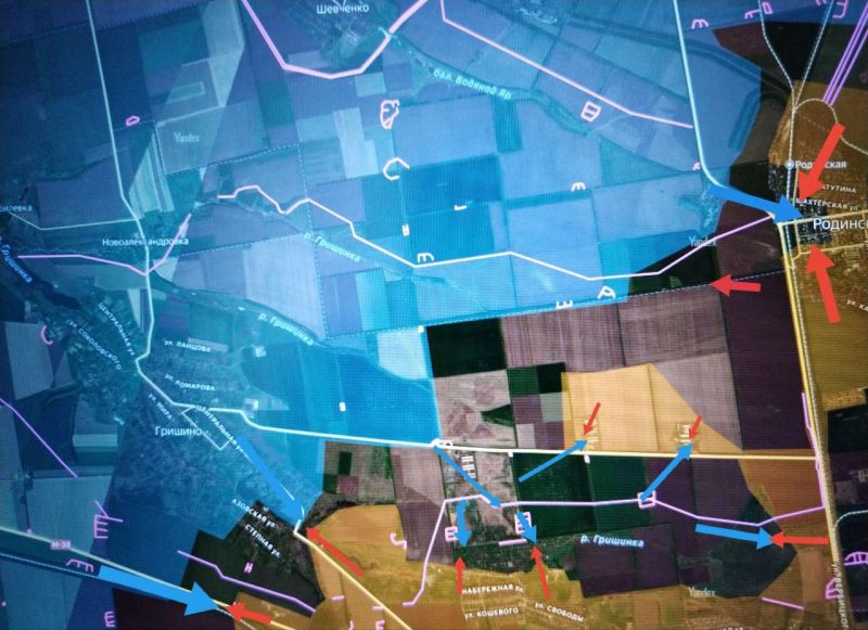 Противник пытается сохранить под контролем отбитую в результате контратак дорогу между ГРИШИНО и РОДИНСКИМ (примыкает к дороге из Покровска (Красноармейска) севернее хутора Запорожский). ВС РФ удерживают северные постройки на фермах у этой дороги. За противником остаются опорные пункты противника южнее этой дороги (севернее окраин Покровска (Красноармейска)).