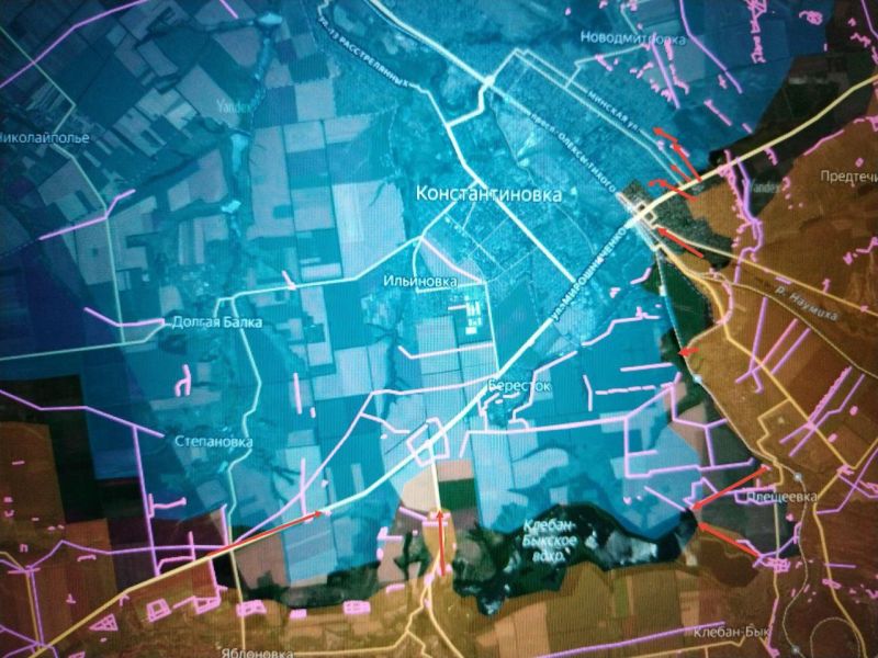 Южнее Константиновки наши подразделения вышли на высоты севернее Клебан-Быкского водохранилища, одновременно атакуют в их направлении со стороны ИВАНОПОЛЬЯ и ПЛЕЩЕЕВКИ. Им на встречу продавливают вражескую оборону подразделения вдоль трасс Т-0504 (севернее Яблоновки) и Н-20 (севернее Александро-Калиново) в направлении укрепрайона ВСУ у перекрёстка этих дорог, являющегося одним из ключевых в данном районе.