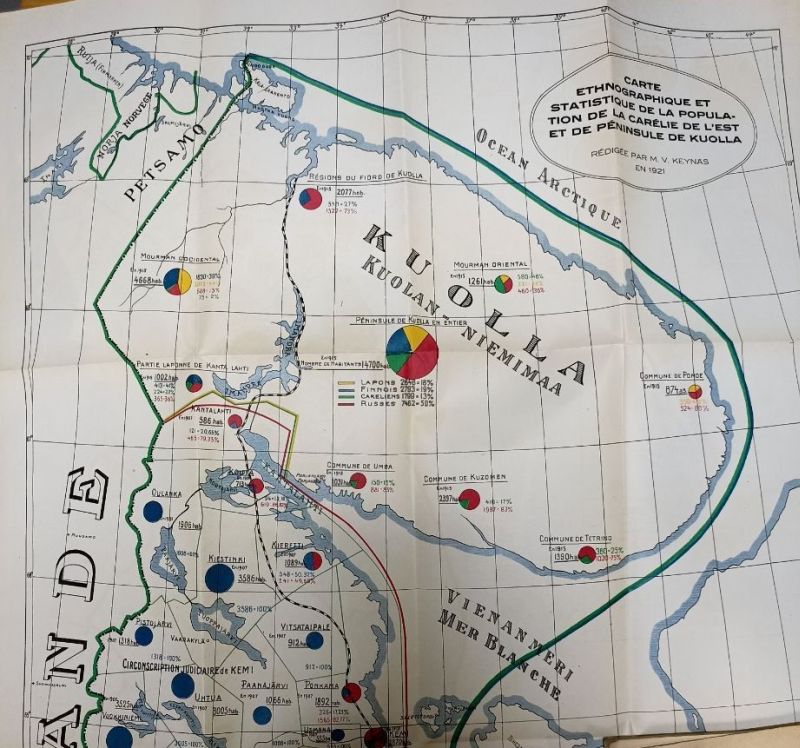 Территориальные претензии Финляндии на "Восточную Карелию" России вплоть до Белого моря, включая Кольский полуостров (1922). Источник: Le Droit de la Carélie: Supplément Carte Ethnographique et Statistique de la Carélie Orientale et de la Péninsule de Kuolla par M. V. Keynäs / Gouvernement Central de la Carélie. Helsinki: Juusela & Levänen O.Y, 1922. 109 P., 2 cartes.