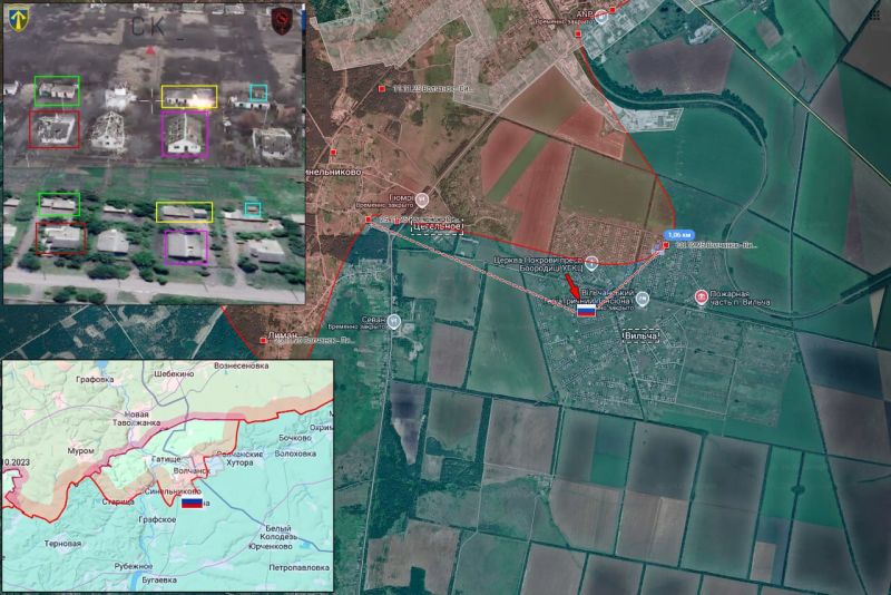 Передовая позиция ВС РФ в жилой застройке ВИЛЬЧИ под огнём противника. Штурмовые подразделения ВС РФ продвинулись около километра и заняли новые позиции в центральной части посёлка.