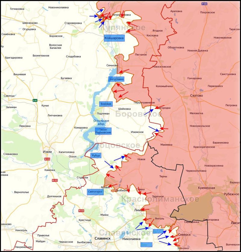Бои идут на восточных окраинах ОЗЁРНОГО. Зафиксировано продвижение северо-западнее ДИБРОВЫ в обход КРАНОГО ЛИМАНА. Продвижение осложняют удары ВСУ с правого берега Северского Донца (Закотное, Кривая Лука). Карман между Ямполем и левым берегом Северского Донца сжимается. ВС РФ предпринимают попытки форсирования реки малыми группами на лодках севернее ЗАКОТНОГО.