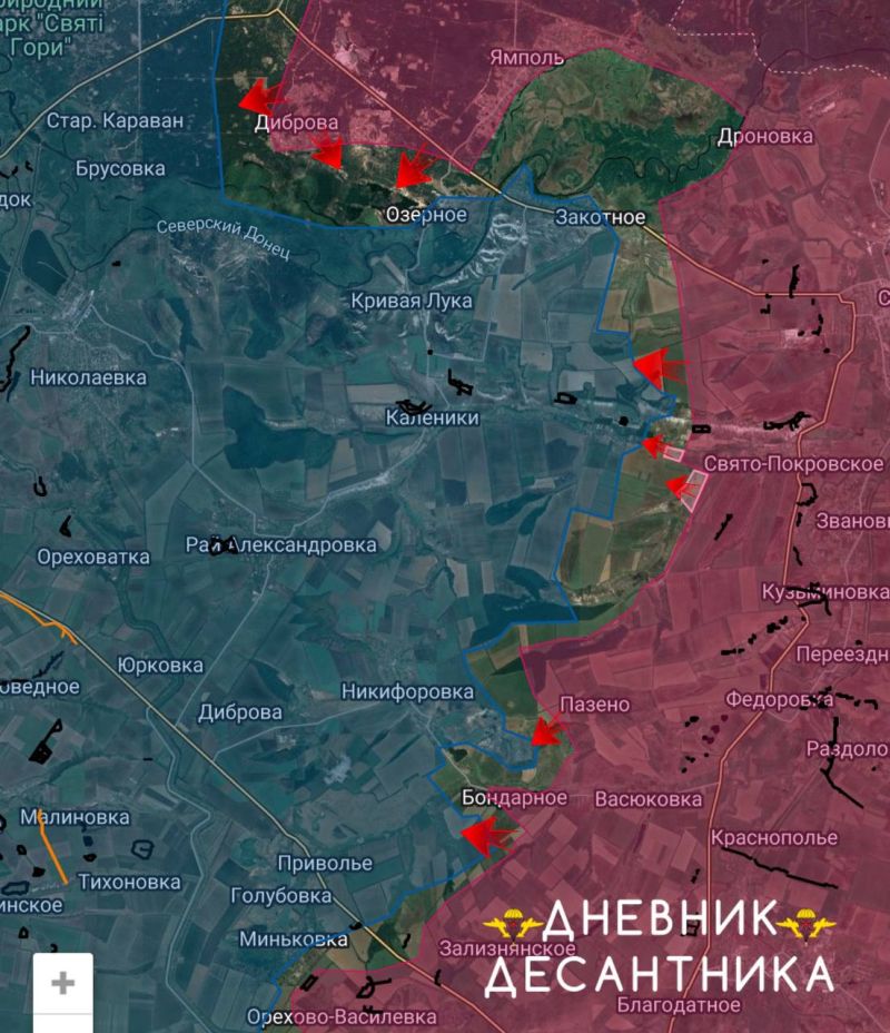 ВС РФ продвигаются по дороге на ПРИВОЛЬЕ, выравнивают линию НЕЛЕПОВСКОЕ – ПЕТРОВСКОЕ, закрывая карманы у ВАСЮКОВКИ. Расширен контроль севернее ФЁДОРОВКИ и на высотах у РЕЗНИКОВКИ. Есть успехи у ОЗЁРНОГО, продолжаются бои за ЗАКОТНОЕ.