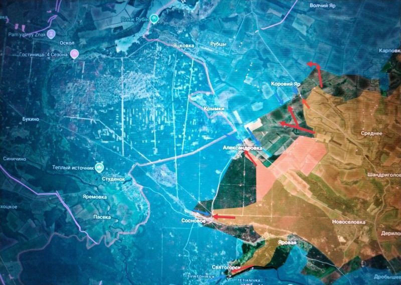 ВС РФ удалось сломить сопротивление противника, перерезать дорогу между КАРПОВКОЙ и КОРОВЬИМ ЯРОМ и продвинуться дальше, в районе балки КРЕЙДЯНОЙ (Меловой) ЯР и сада, охватывая КОРОВИЙ ЯР с фланга. Данный прорыв несёт угрозу вклинения наших подразделений между КОРОВЬИМ ЯРОМ и РУБЦАМИ, что ещё больше осложнит логистику противника на участке, особенно, учитывая наше продвижение к дороге между КОРОВЬИМ ЯРОМ и АЛЕКСАНДРОВКОЙ в районе дома инвалидов, электроподстанции и балки ПОПОВ ЯР.