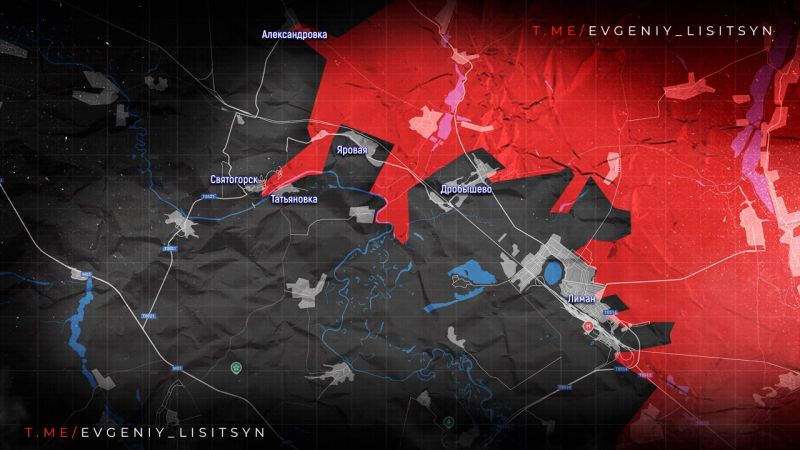 Российские подразделения остановили контратаку ВСУ северо-восточнее СВЯТОГОРСКА и не позволили противнику снять угрозу гарнизону КРАСНОГО ЛИМАНА. Удерживается коридор между ДРОБЫШЕВО и ЯРОВОЙ, через который наши войска давят на коммуникации Краснолиманской группировки.