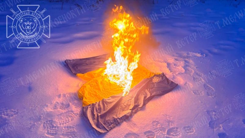 Пропагандистская акция ВСУ завершилась традиционно: украинский флаг был сброшен и сожжён нашими бойцами, которые водрузили православное знамя.