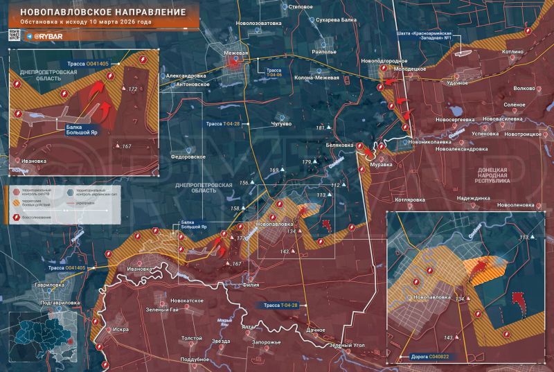 В районе БЕЛЯКОВКИ обстановка остается сложной. Здесь пока выйти на высоты не удалось на фоне продолжения боев за НОВОПОДГОРНОЕ. На южном фланге ВС РФ пытаются продвигаться между ИВАНОВКОЙ и НОВОПАВЛОВКОЙ, понемногу забирая лесополосы, где ранее противник совершал вылазки.