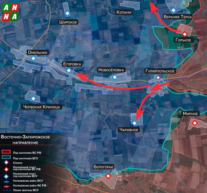Освобождение армией России Гуляйпольского может дать отличную опору для продвижения дальше в Запорожской области: через НОВОСЁЛОВКУ к ЕГОРОВКЕ, а затем к важному узлу обороны и снабжения – ОМЕЛЬНИКУ.